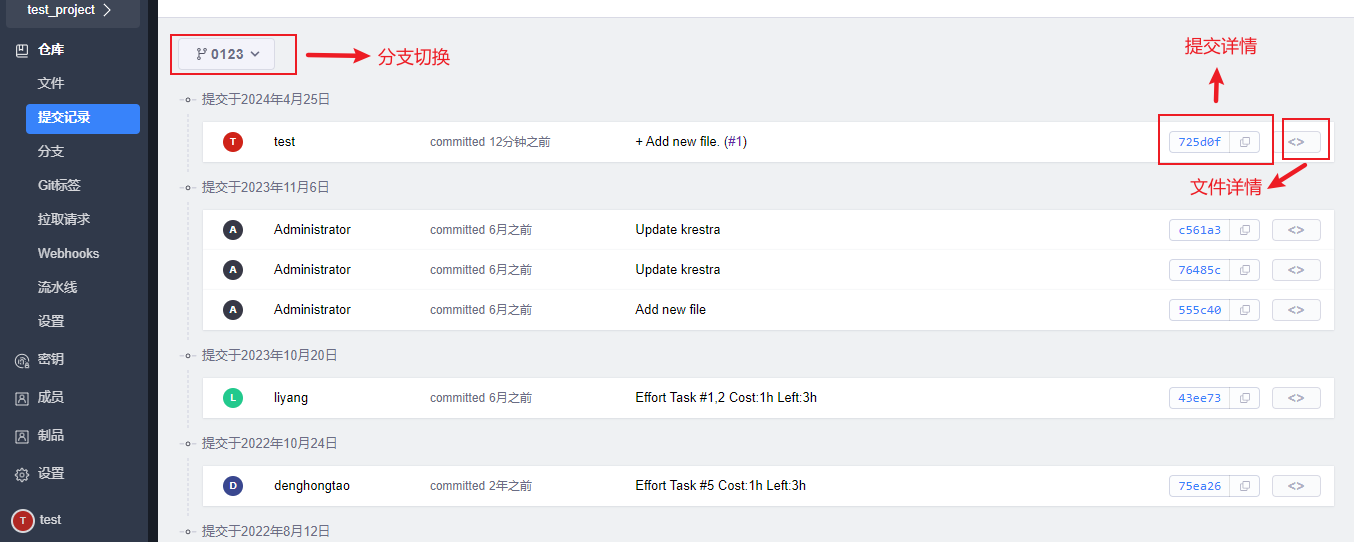 在提交记录页面可以查看每个分支或者标签上的提交信息和文件详情