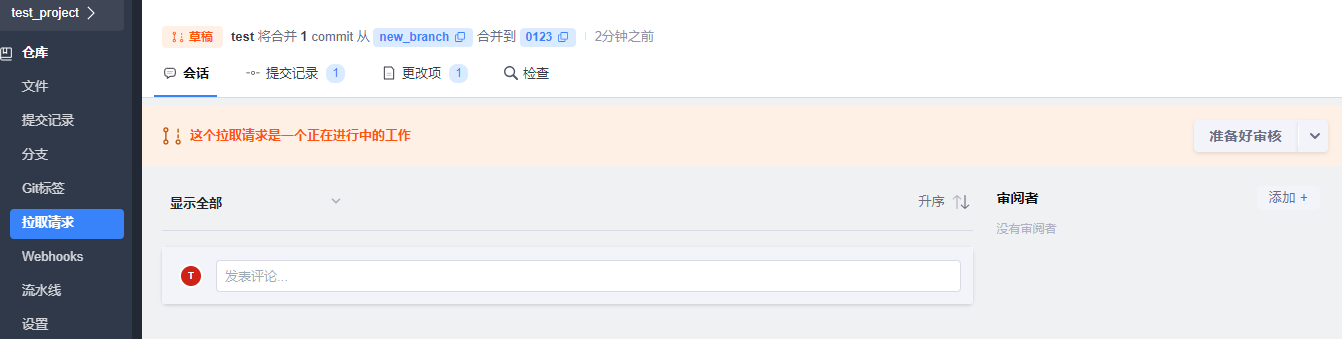 点击准备好审核,草稿状态的拉取请求就变为正式的合并请求
