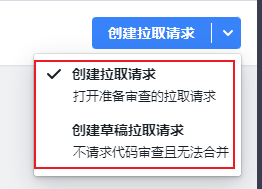 选择基准分支和合并分支后,点击创建拉取请求按钮,会创建一条拉取请求,可以选择是创建草稿或者正式拉取请求