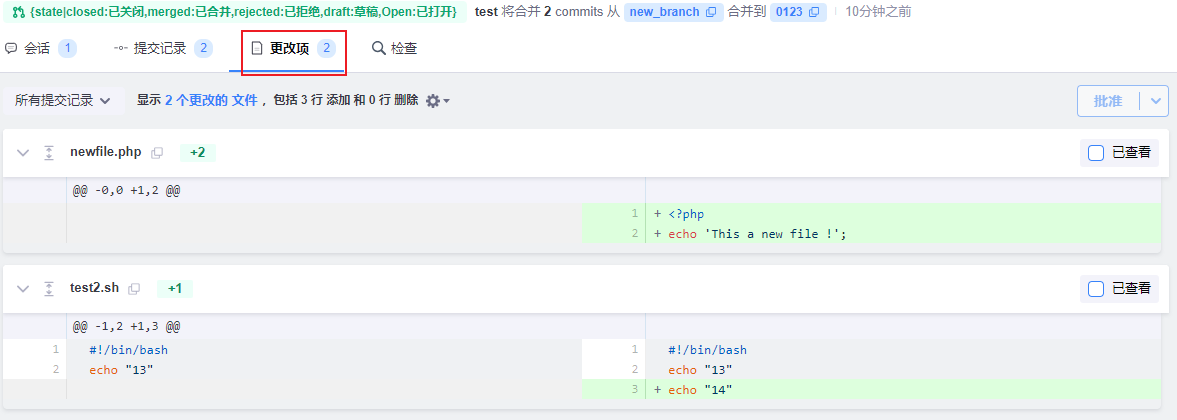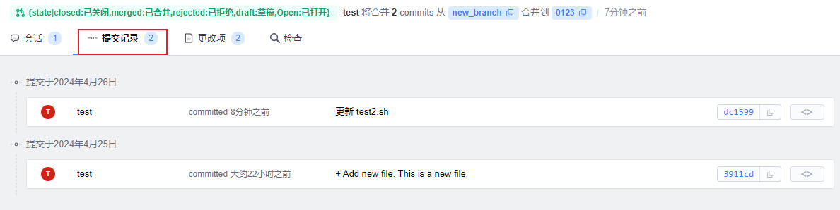列表中点击合并请求的信息能够查看合并请求的详细信息