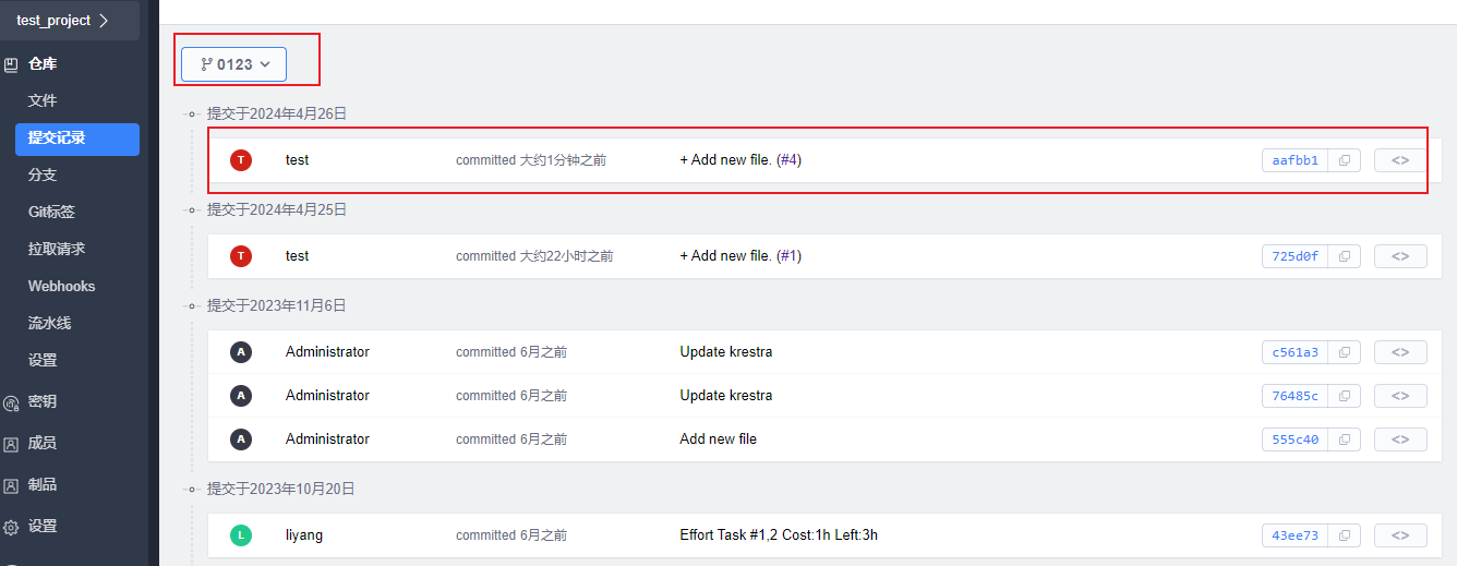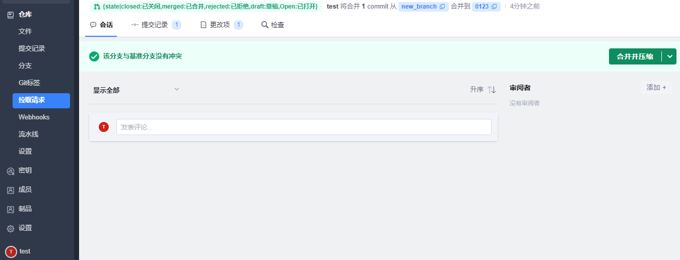 拉取请求列表中选择一个打开状态的拉取请求。查看请求详情页,会看到合并按钮,目前支持合并压缩、直接合并和变基合并三种合并方式