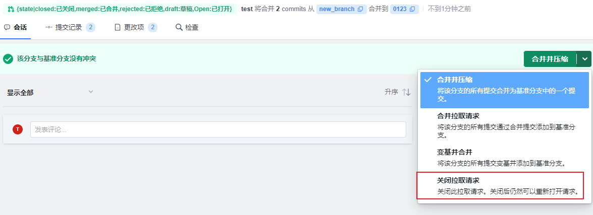 如果不想合并已经创建的拉取请求,那么可以选择关闭拉取请求