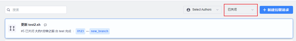 关闭拉取请求后,可以在请求列表的关闭标签页下看到