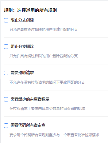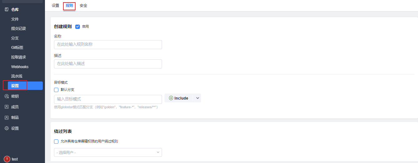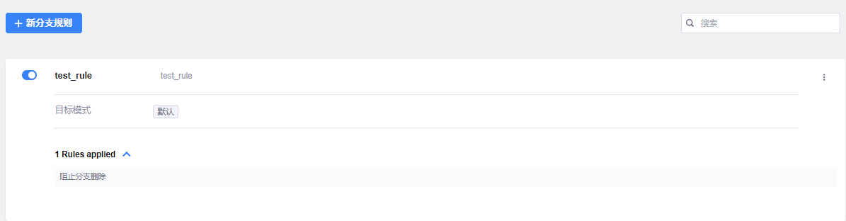 在设置导航下的规则tab页下,会显示设置的分支规则,点击新建分支规则按钮,会显示规则页面‘