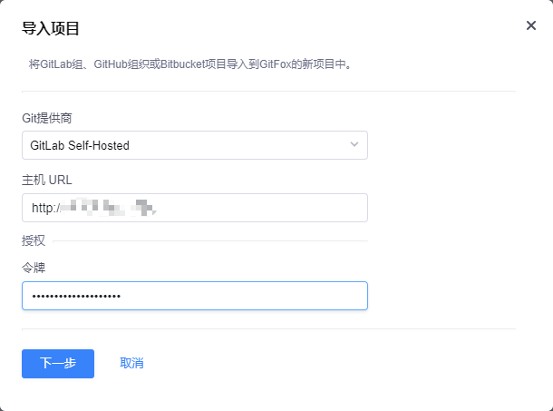 选择Git提供商、主机URL和授权令牌后,点击下一步(这里以GitLab服务商为例)