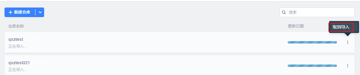 等待进度条停止后,导入的代码库就正常展示在仓库列表了,如果不想导入了,可以点击进度条右边的更多按钮,点击取消导入