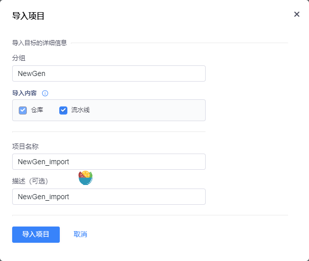 导入的目标的详细信息输入完成后,还需要设置导入后的项目信息,如项目名称和描述(可选)